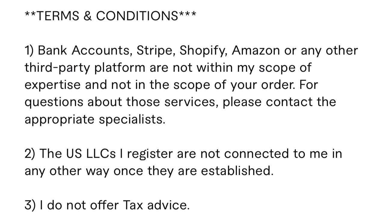 - Bank Accounts, Stripe, Shopify, Amazon or any other third-party platform are not within my scope of expertise and not in the scope of your order. For questions about those services, please contact the appropriate specialists.